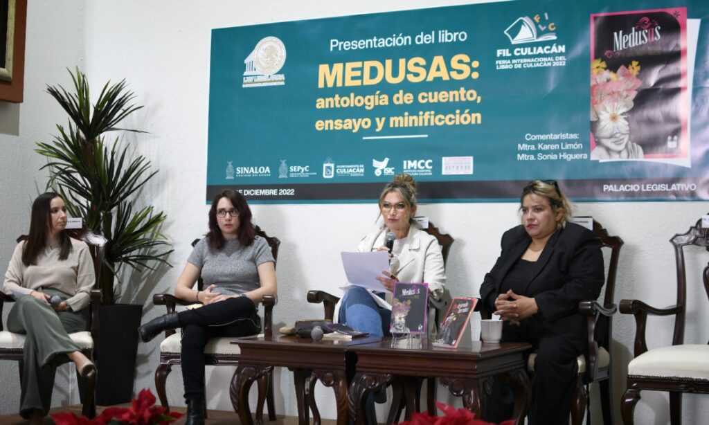 Culiacán, Sin., a 9 de diciembre de 2022.- Como parte de las actividades de la Feria Internacional del Libro Culiacán 2022, en su sede alterna situada en el Congreso del Estado de Sinaloa, se realizó la presentación del libro, «Medusas: antología de cuento, ensayo y minificción», obra literaria que recopila interesantes ideas e historias personales de mujeres inquietas y valientes. De la autoría de la maestra Sonia Higuera, el presente libro fue expuesto como el origen de diversos ensayos y textos literarios surgidos en diferentes talleres, que, al unificarlos y plasmarlos en nueve historias narradas por escritoras, tiene como resultado la introspección que cada una de ellas representa en el ámbito, laboral, personal y profesional. “Quiero agradecer por la invitación a esta presentación, es un honor para mí traer este libro, es fruto de un trabajo muy largo de todo un proceso. Me da mucho gusto ver que hay tantos jóvenes que pueden ser potenciales futuros escritores y que de que algunas formas puedan ver en la escritura, un efecto de catarsis o de poder trascender de alguna forma”, detalló la escritora Sonia Higuera. En este orden, detalló que, a través de la coordinación de talleres de habla hispana, bajo el proyecto, “Tejiendo historias”, nació ´Medusas´, luego de revisar alrededor de 18 talleres en los que surgieron textos de muy buena calidad. Finalmente, la diputada Celia Jáuregui Ibarra, Presidenta de la Comisión de Biblioteca y Cultura Parlamentaria del Congreso del Estado de Sinaloa, comentó y concluyó que el libro a través de este tipo de ejercicios invita a toda la ciudadanía a adentrarse en el mundo de la literatura, y a propiciar el semillero de nuevos escritores..